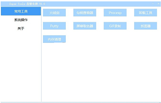 SuperTools是一种便捷、好用、高效率的桌面工具,该软件可以在系统上运行G的最新版功能十分全方位IF视频录制工具,进而将一切动漫內容视频录制成GIF,您还能在系统中运行爬取功能,快速截图桌面上的其他地区,或运行卸载掉工具,并彻底卸载掉电子计算机安裝的APP。工具箱集成化了火绒剑、截屏工具、软件删除工具等多种多样功能工具,客户将可以便捷、迅速地应用有关工具的功能,进行电子计算机每日任务的操作。软件绿色安全,系统内存小,对计算机系统的危害几乎可以忽略,软件界面简易整洁,操作简易,可以协助客户开机启动项这种功能,很容易应用,让客户可以享有多元化的系统软件操作功能,无需下载各种各样工具。因此有需要的好朋友来麦葱站下载!