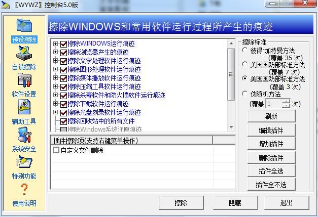 一定要注意,插件擦除包含擦除特定文件、文件夹、硬盘未应用室内空间、垃圾回收站和注册表文件中的印痕,包含下列10个层面: