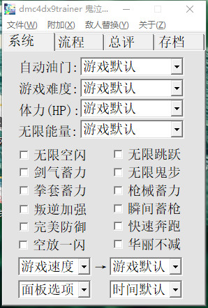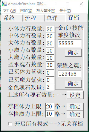 鬼泣4dx9全功能修改器游侠版,在这里面有着极其丰富的功能,其中分为四类,系统、流程、总评以及存档,像什么修改金钱或者是时间都是可以的,非常的变态。有需要的小伙伴们,快来本站下载吧!!!