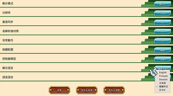 3.语言表达可以设定为繁体版,表明方式、屏幕分辨率、功能键分配等还可以设定。设定进行后,点击储存并运行