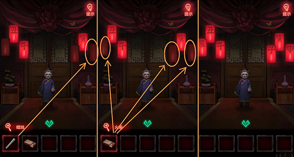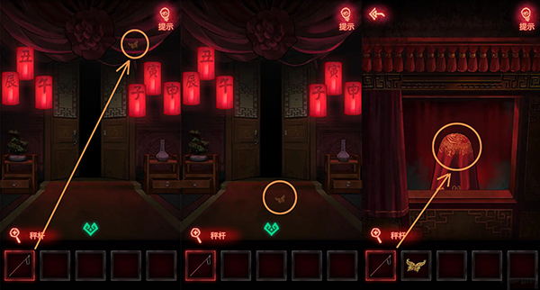 用【秤杆】取小灯笼上的【蝴蝶饰品】,随后用【秤杆】解开红盖,取得【弓弩】。