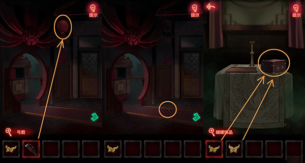用弓弩取得汽球上的蝴蝶饰品,用蝴蝶饰品开启拜天地桌子的小盒子,取得玉镯。
