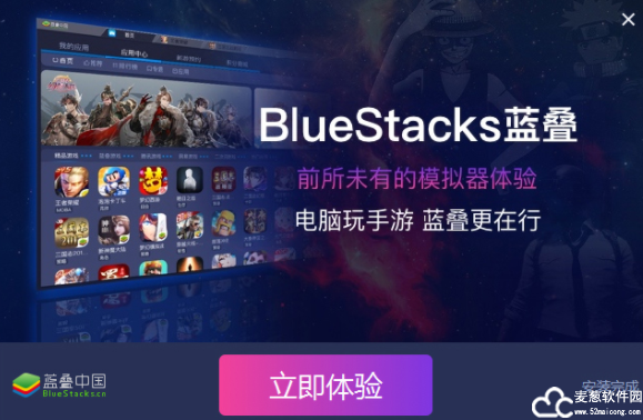 3、蓝叠模拟器安装完成,建议添加桌面图标生成快捷方式,方便在桌面上快速打开。然后我们点击“立即体验”。