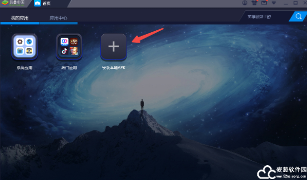4、运行模拟器,点击“安装本地apk”,然后找到在麦葱站下载的软件包中解压的APK文件,双击打开就可以安装了。