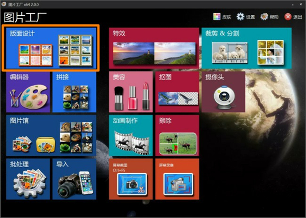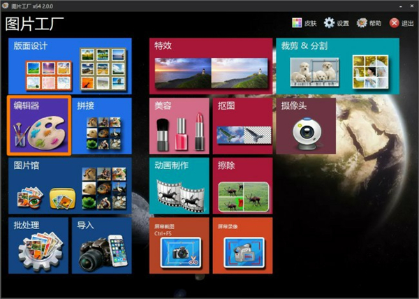 图片工厂免费版功能分区包含合理布局设计方案、编辑软件、图片馆、屏幕截屏、显示屏短视频、动画特效、发掘、拼凑、剪截、批处理命令和监控摄像头