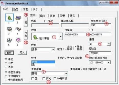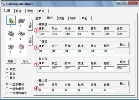 ③努力值:范畴0~255,点击较大就可以全变成255,尽管游戏默认设置较大努力值和是510,可是根据修改器可以做到1530