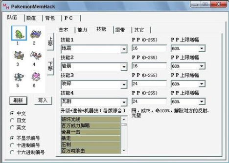 2)口袋妖怪修改器通用版中的各版综合性技能目录:在这里目录中挑选技能,双击鼠标技能1、技能2等,选定技能将经常出现在技能1、技能2等目录中。