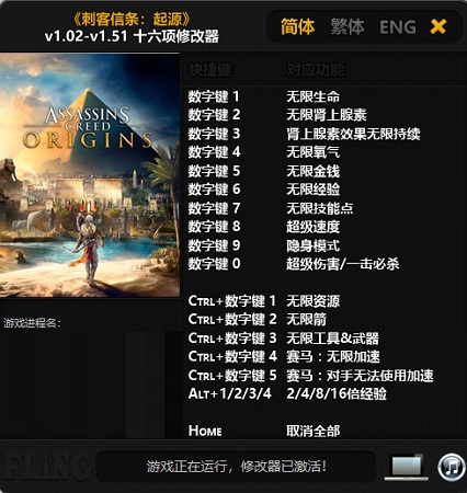 刺客信条起源十六项修改器,可以大幅度降低游戏的难度。