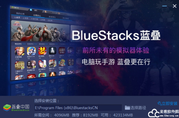 2、双击“BlueStacks4Setup”安装程序,然后进入软件安装向导界面,可选择自定义安装路径。