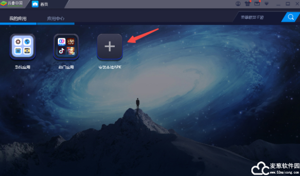 4、运行模拟器,点击“安装本地apk”,然后找到在华军软件园下载的软件包中解压的APK文件,双击打开就可以安装了。