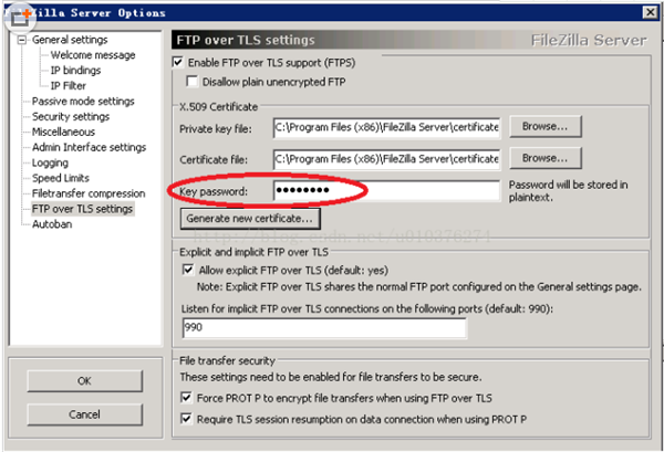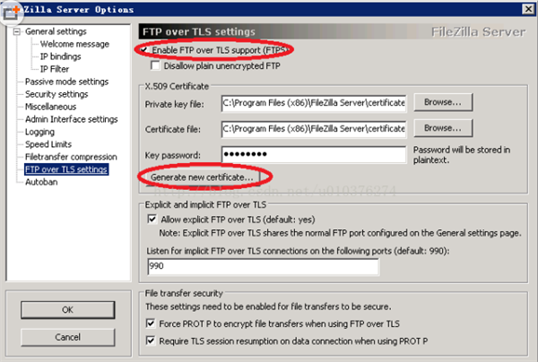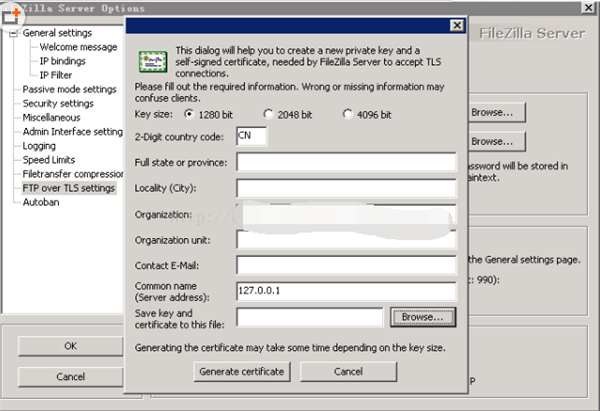 2、选FTP over TLS settings,启用Enable FTP over TLS support点击正中间Generate new certificate。。。按键