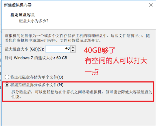 这就是给vm虚拟机分派电脑硬盘的室内空间。一般40G可以了,有空间的可以打大一点。