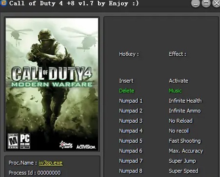 使命召唤4修改器正式版是一个为同名的游戏建立的修改器专用工具,玩家可以给予8种实际操作輔助,如无限生命、无限炮弹、无弹性、无后坐力等。修改器的应用比较简单,实际操作游戏,开启修改器,按相对应的热键。
