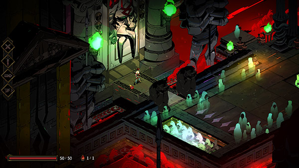 Supergiant各种各样游戏形式多样,大气磅礴,游戏与小故事叙述紧密结合的特有设计风格,在这里款游戏中主要表现得酣畅淋漓:壮阔的手绘画冥界自然环境和恐怖的原创设计背景音乐,构建出忧郁可怕的冥界气氛,令人亲临其境。
