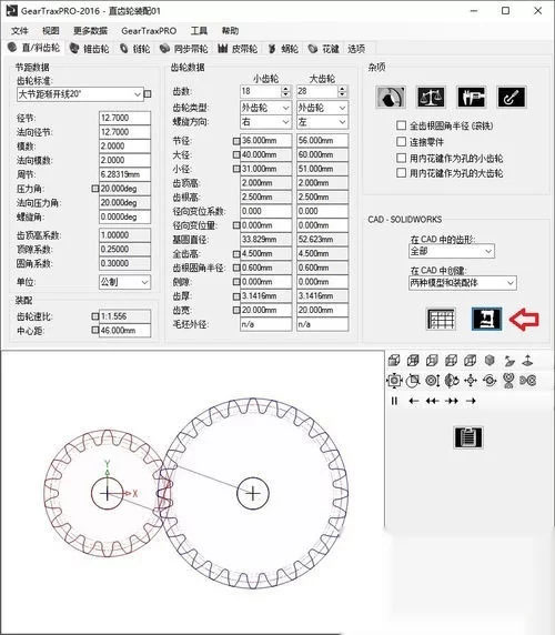 2.如下图所示,设定各类主要参数后,点一下红色箭头处的按键,就可以在S中应用olidworks中全自动生成模型。