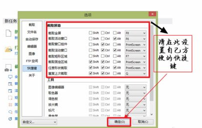 4.在picpick破解版中的选择项对话框的左栏中,点击键盘快捷键,相对应的设定选择项将发生在右边。这时,可以设定截图键盘快捷键。设定后,点击明确。
