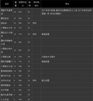 以上的数值都是在武器强化最高,人物属性全满的情况下得出的,都是单手的攻击数值,武器入选的都是要求在单手状态下,攻击方式要求舒服安全的,命中范围广的,只能双手攻击才好用的武器不入选。当然这些武器双手后照样也比同类好用,每种常用武器选个最高攻的做代表,属性武器是指随便附一个魔法属性攻击都一样,武器可以按重量分类,一般越重出手速度越慢,我下面说的同类是指重量差不多一样的,我是玩力量流的,那种敏捷的轻武器我就不管了,没时间搞了,反正搞了一个晚上才完成,都没时间玩游戏,要一把把武器攻击看过还要去变质。