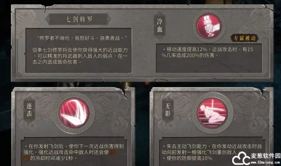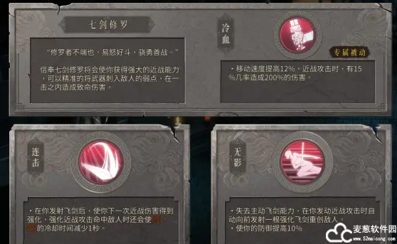 用玩家最开始就能接触到的“七剑修罗”宗派为例,其默认的专属被动能力是“冷血”:移动速度提高,近战有一定几率造成翻倍伤害。