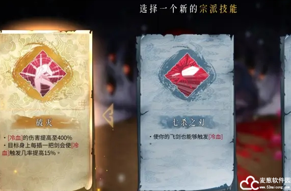 有的则是特定宗派专属的,例如“破灭”是让七剑修罗宗派的通用被动效果冷血有概率产生的伤害翻倍效果变成四倍,而且目标身上每插着一把剑则冷血的触发概率提高15%。