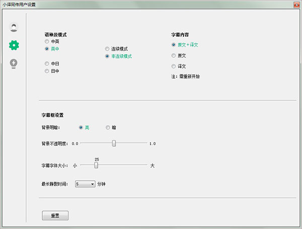 小译同传电脑破解版还在原先的基础上去除了时间限制以及加入了会员效果,这样就能够为用户带来非常便捷、非常实用的操作体验。使用方法也很简单,你只需要打开这款软件然后打开你没有中文字幕的影视作品,鼠标轻轻的点击一下软件的开关然后开始播放,你就会发现软件自动实时给你翻译出来了中文字幕。而这款软件最大优势就是同声传译,他这个单词刚开始读完立马就能翻译出来,虽然存在延迟但是这一点点延迟仅凭人的反应是无法察觉的。