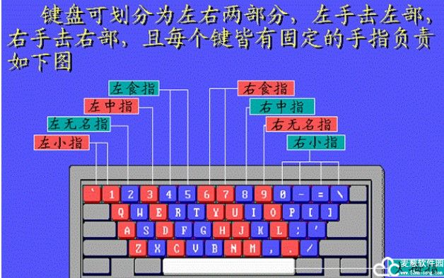 字根练习分五区练习,按需要显示口诀,指示键位和指法