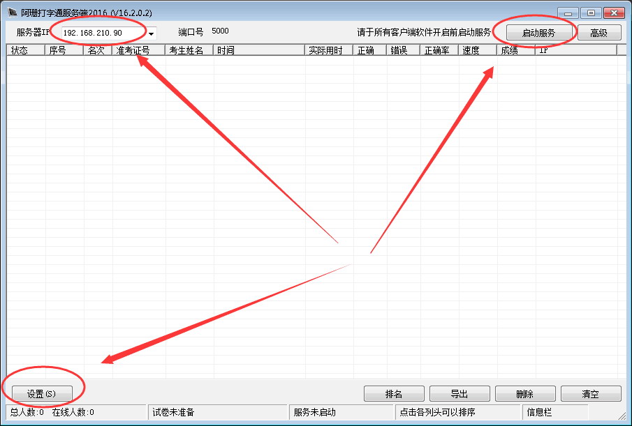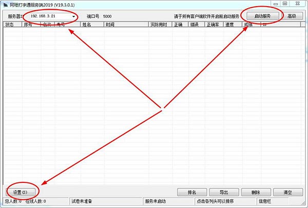 3、将左上角的服务端IP告诉学生,点击右上角“启动服务”,点击左下角“设置”按钮。