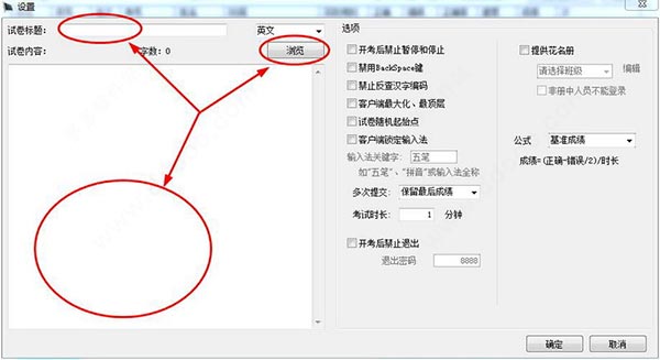 4、在服务端的“设置”界面中,输入试卷的标题、内容,保存即可。或者,也可以点击“浏览”按钮,加载TXT文件。右侧一系列选项,根据需要可以勾选。