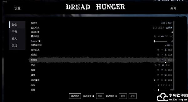9、进到Dread hunger中文版游戏后,我们可以根据自己的习惯设置影像、声音、输入以及游戏。