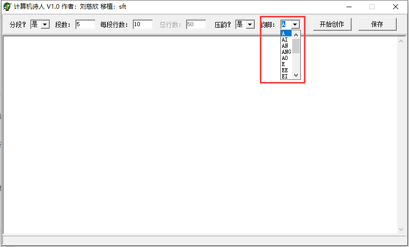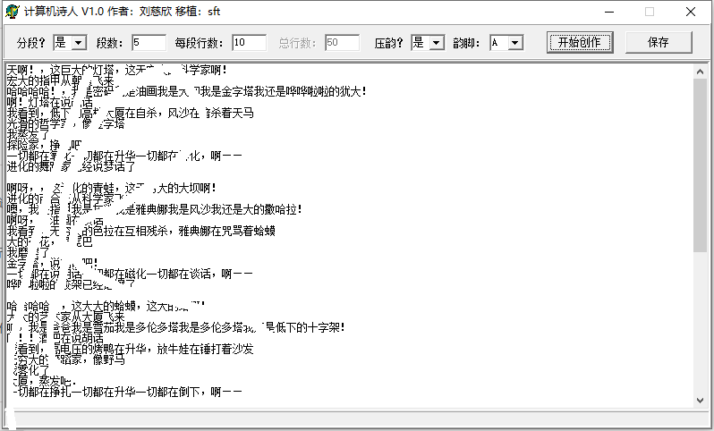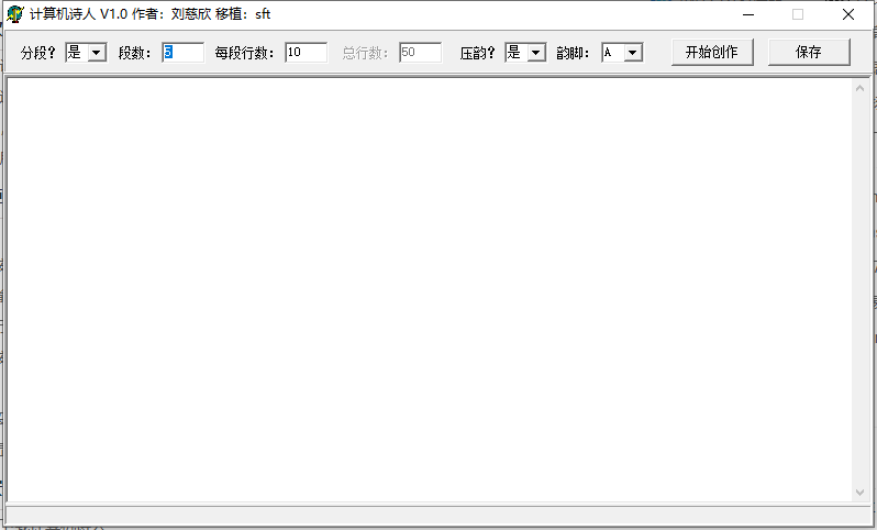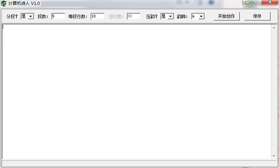 计算机诗人电脑版可以利用电脑自动作诗,软件主要是将大量词汇根据韵脚进行随机组合,一键生成近体诗,方便快捷,打油诗专属。软件在使用时先设置参数:是否分段分段、段数、每段行数、是否押韵以及韵脚。然后点击开始创作按钮即可自动创作。并且还能够直接复制进行使用,还可将创作结果保存在本地,永久进行使用,这么好用的软件,赶快下载试试吧!