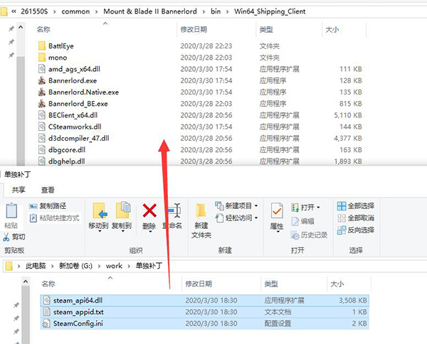 3、解压完成后,将全部破解补丁文件复制到:commonMount & Blade II BannerlordbinWin64_Shipping_Client路径下替换
