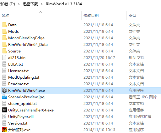 4、在RimWorld.v1.3.3184文件夹中,左键双击RimWorldWin64.exe进入游戏;