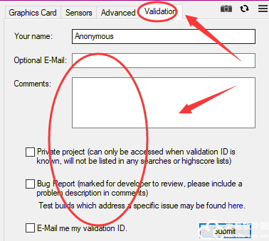 4、验证选项中可以输入自己的名称以及邮箱来提供意见和建议。