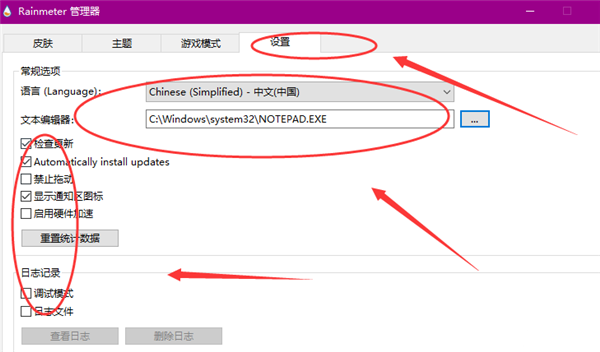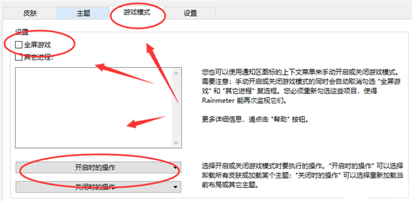 5、Rainmeter中文版还可以设置游戏模式,就比如全屏游戏以及其他进程时,壁纸该怎样运行。