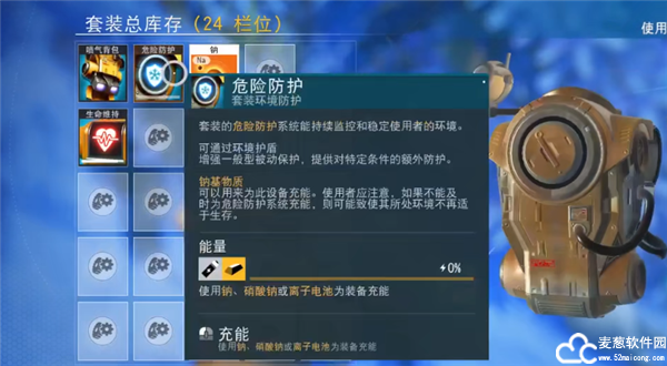 5、然后打开背包给危险防护设备进行充能,而充能就需要钠元素。