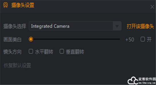8、点击工具栏的“摄像头”,弹出摄像头设置界面,选择摄像头类型,画面美白,镜头方向,选择完毕之后点击“确定”。