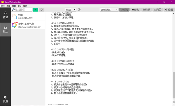 OpenWebMonitor无限制破解版作为一款非常好用且操作简单的网页内容变化监控软件,能够帮助用户实时了解网页的状态以及各种更新内容,并且使用起来也是极其的简单。用户在我们麦葱站下载软件后,直接安装即可使用全部的功能,并且是无限制使用的,因为该软件是经过大神用户破解处理的,不管用户使用了多少次,都不会受到限制,在里面有着强大的破解补丁作为支撑,所以用户可以不用担心这类问题的出现。话说回来,软件中的功能都是非常的实用的,就比如它可以支持任何一个网页,不仅仅是临时的,就算是需要账号登入的也能够完成兼容,从而能够大大的提高用户的使用效率,非常的人性化。除此之外,OpenWebMonitor无限制破解版还能够对网页中的关键词以及git diff差异分析等进行监视,从而能够满足用户日常的使用需求,十分的方便。最主要的是软件可以注入脚本以及对高级定时器进行有效的编辑,从而能够提高软件的灵活性,达到监控配置的目的。有需要的小伙伴们,快来本站下载吧!!!