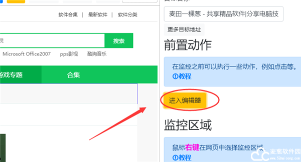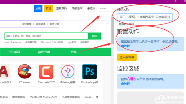 输入网站后,软件会将网页元素进行区域划分,右击即可选中需要监控的区域,还可设置前置动作,为监控前加入各种点击操作,可模拟自动登录等人工动作