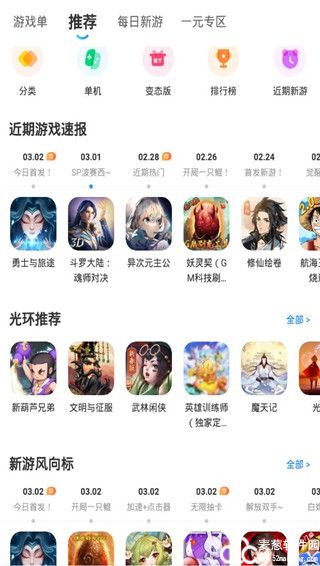1、推荐界面分为单机、分类、变态版、排行榜、近期新游五大板块