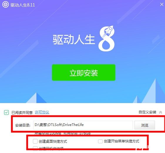 3、这边可以自定义安装,小编选择空间较大的D盘,勾选掉启动项和创建快捷方式