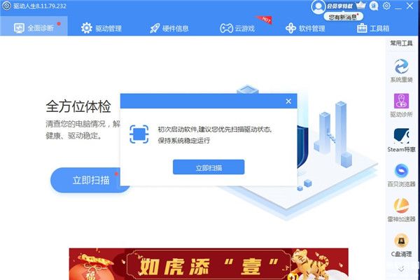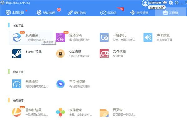 除了对电脑驱动的管理检测和下载之外,软件还提供了系统重装、c盘清理、文件恢复、steam特惠、驱动诊所等服务,便民便利