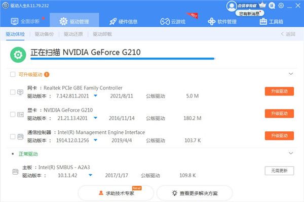 2、这边已经对我的电脑进行扫描了可以看见有需要升级的显卡、网卡和声卡等,也会显示正常驱动