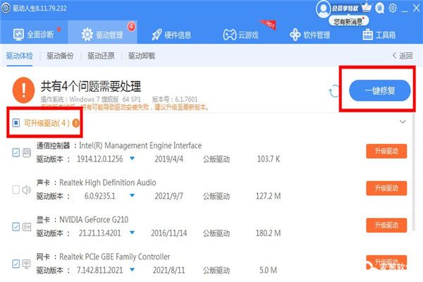 3、如果有需要的话可以点击全选,然后进行一键修复,软件就会自动升级驱动了