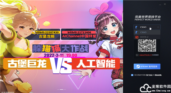 1、双击打开完美对战平台,进入登录界面,这里我们可以选择CSGO或者是DOTA2游戏,使用steam账号进行登录或者是通过手机验证码登录都是可以的。