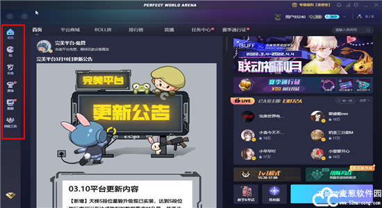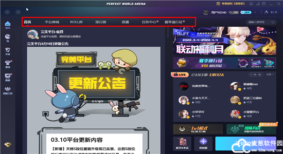 3、首页中我们可以看到平台商城、ROLL房、排行榜、直播、任务中心、赛季通行证书。