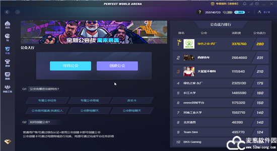 4、公会界面,我们可以在右边看到平台排名前十的大公会以及公会战力,通过【寻找公会】或者【创建公会】加入或者是成立属于自己公会。