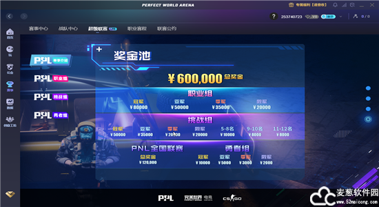 5、赛事界面是由平台组织的赛事,可以看到我们的奖金池,以及参赛的队伍,有职业组、挑战组、勇者组,获得名次就可以得到奖金。