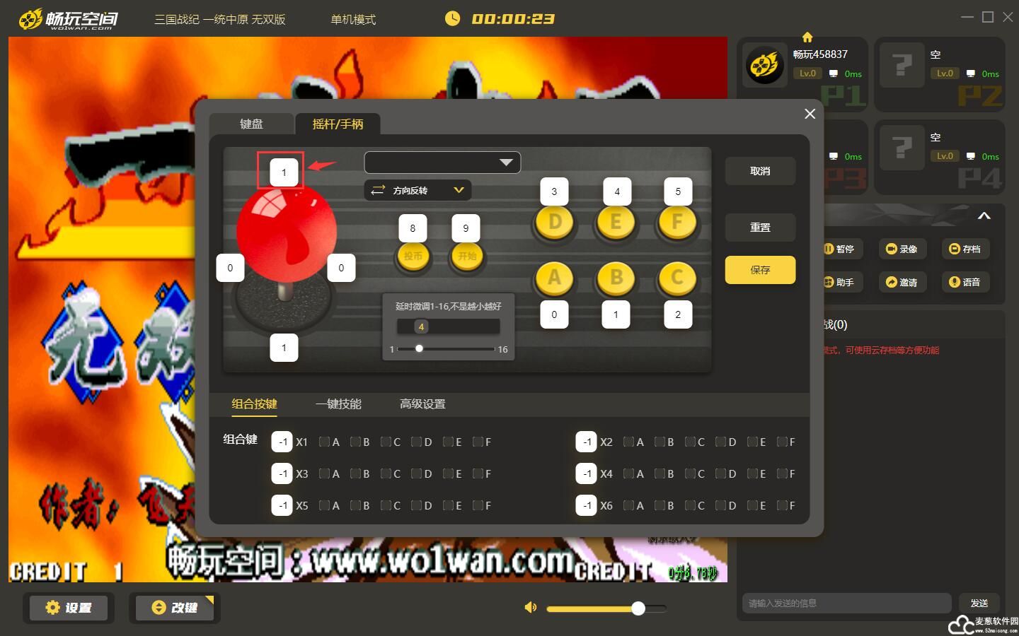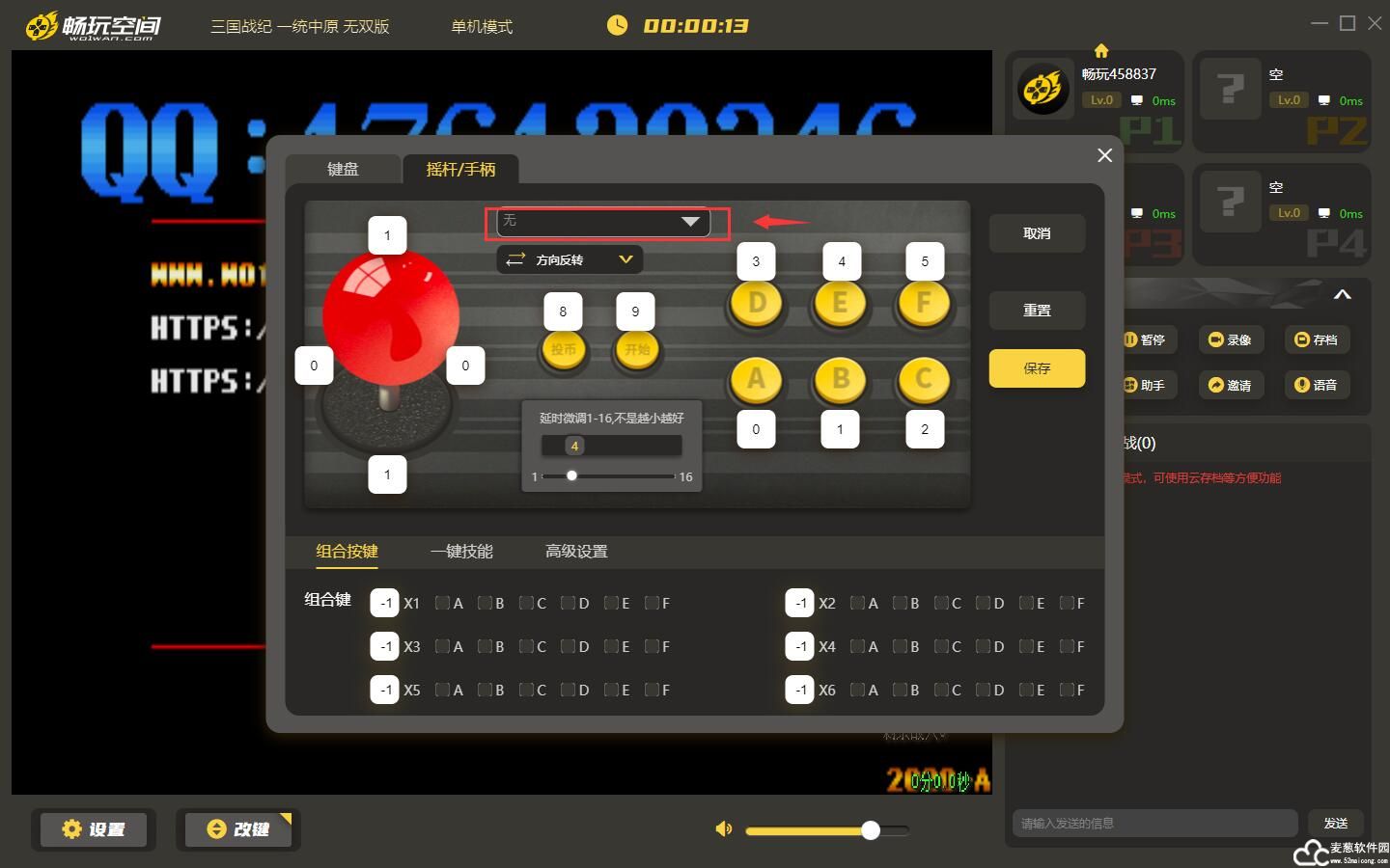 4、进入到畅玩空间电脑版中的改键界面后,选择【手柄/摇杆】,这里会显示为“无”,然后操作一下摇杆,会变成空白或者摇杆名称,表示已经识别到了设备。