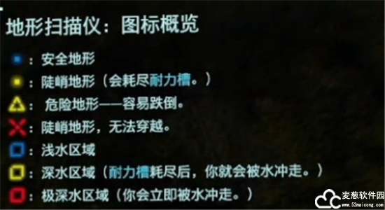 赶路途中,用扫描仪扫描地形,蓝色标记表示平坦安全的区域;黄色标记表示有点危险,要小心通过,注意别摔倒了;红色标记表示深水、陡峭的地形等危险,最好不要靠近。