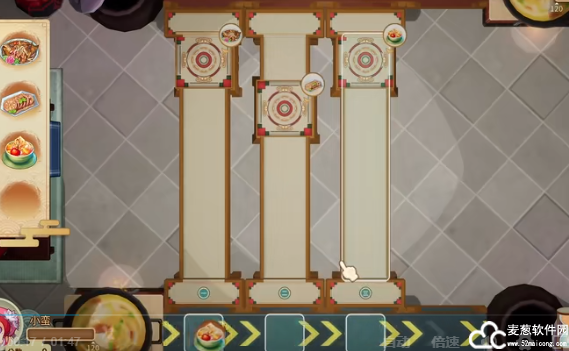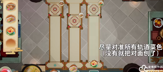 具体的过程则是我们要先用1、2、3、4数字按键选择通道,等传送带的菜到通道上的时候按方向键上或者是空格,然后才就会进入传送带上,在传送带有个通道口,等我们的菜品到了通道口的位置时,按下方向键下,或者回车,就可以停下来加分,如果对面比我们先到通道口,我们可以选择用菜去抵消掉它的菜品。