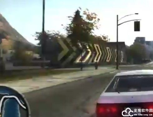 钉板具有很大的隐蔽性,在高速驾驶中很容易被忽略。不过也是可以发现的,特点就是在小地图上你可以看到前方有一辆警车横在路边,千万不要以为警车坏了或者他在停车放水。旁边那看似平整的马路就是钉板所在。OK,找到就好办了,转向瞄准那辆警车屁股一脚踹过去,搞定。